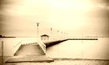Vintage retro filtered wooden pier at sunset, Stepnica, Poland.