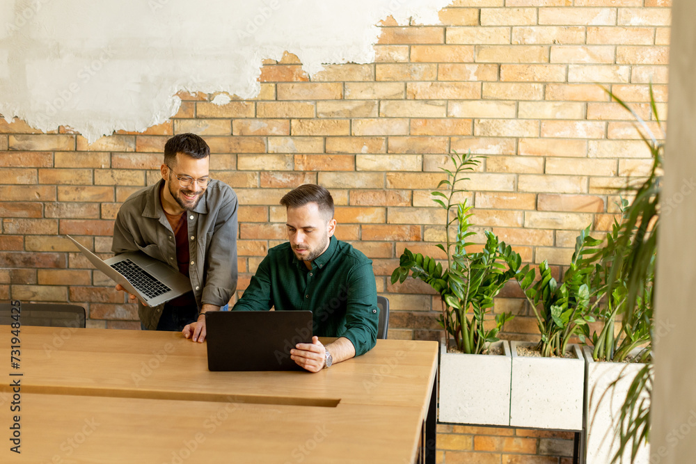 Collaboration in Motion, Professionals Working Together in a Modern Brick-Walled Office