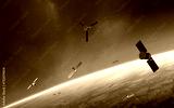 3D illustration of a graveyard of satellites, junk and debris swirls around the Earth. High quality digital space art in 5K - ultra realistic visualization.