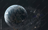 3D illustration of a graveyard of satellites, junk and debris swirls around the Earth. High quality digital space art in 5K - ultra realistic visualization.