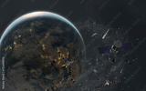 3D illustration of the problem of pollution of the Earth's orbit by debris, junk and satellites. High quality digital space art in 5K - ultra realistic visualization.