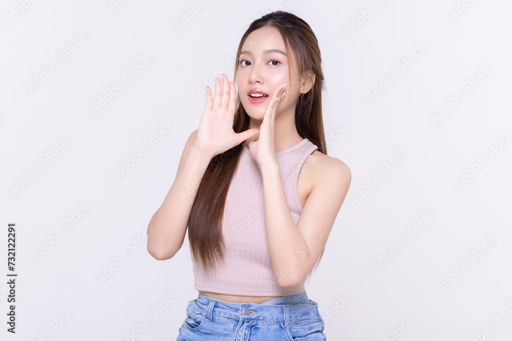 Beautiful young Asian woman with open mouths raising hands screaming announcement on isolated white background. Facial and skin care concept for commercial advertising.