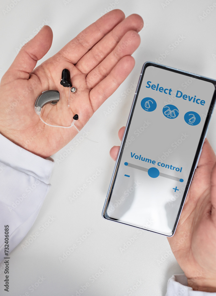 Doctor audiologist showing smartphone app for adjusting hearing aids holding smartphone in one hand and hearing aids in other. Manage hearing aid settings via smartphone