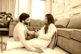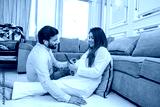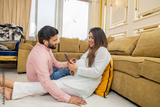 Happy indian couple expecting a baby both sitting near sofa spending time together wife holding smart phone and husband with earphone listing songs. healthcare concept