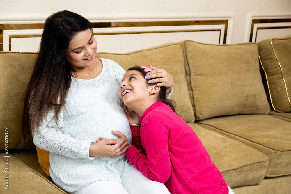 Happy indian woman expecting a baby daughter touching her belly while sitting on couch. healthcare concept