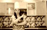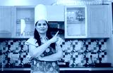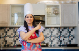 Beautiful indian woman dressed in cook uniform wearing a apron, chef hat standing in kitchen gesturing, pointing with hands. Marketing & Promotion Concept.