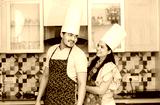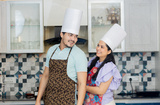 Happy indian couple dressed in cook uniform wearing a apron , chef hat ready to make tasty food. Standing in kitchen and having fun.