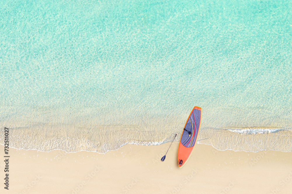 Top view of SUP board for surfing on the shore on tropical Seychelles sand beach. Blue, turquoise transparent water surface of ocean, sea, lagoon. Aerial, drone view