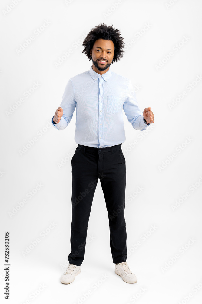 Advertising concept. Excited happy African-American guy demonstrating size of product with hands, measuring empty space, over white background. Black man holds imagined object, something in palms