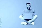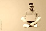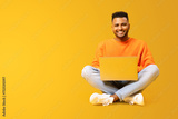 Smiling joyful indian man using laptop computer isolated on yellow. Portrait of male freelancer or student using computer sitting on the floor and looking at the camera
