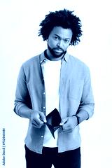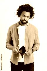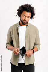 Upset African-American 30s unemployed man is demonstrating empty wallet isolated on white background, disappointed curly guy has lack of money, difficult financial situation due to the economic crisis