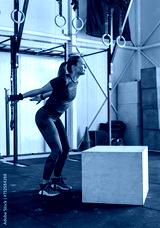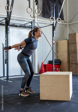 Fitness woman doing box jump workout at cross fit gym