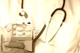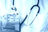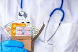 Home doctor visits, online medical shopping, home delivery of medicines from the pharmacy. Health concept, cardboard Doctor delivers box with pills, medicines,