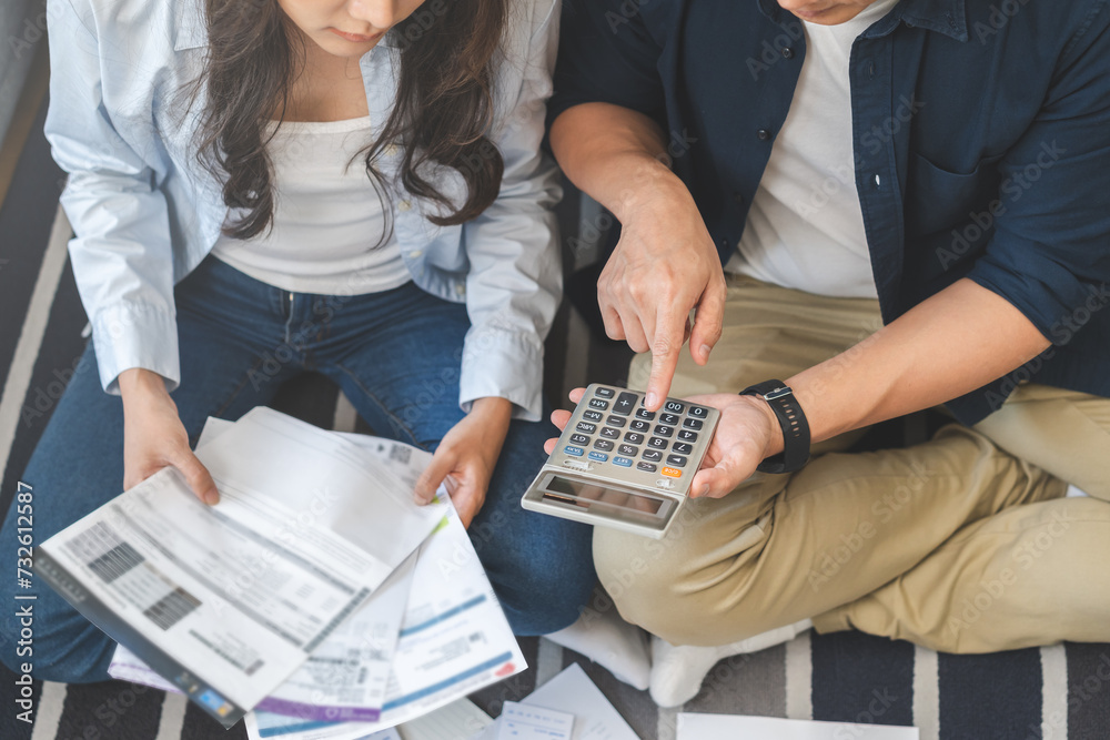 Stressed financial owe asian young couple love sitting stressed and confused hand calculate expense from credit card, invoice no money to pay, mortgage or loan. Debt, bankrupt or bankruptcy people.