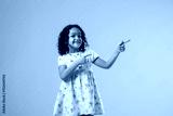 Smiling child girl pointing to an empty place on yellow background. Advertisement concept