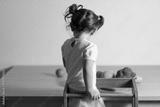 Cute caucasian brunette toddler girl with two tails in white dress staying at the learning tower with her back, cutting vegetables, Montessori method on white background