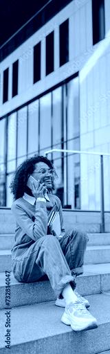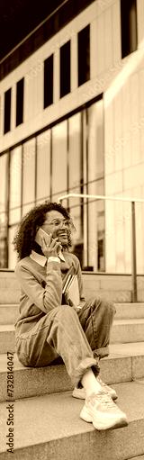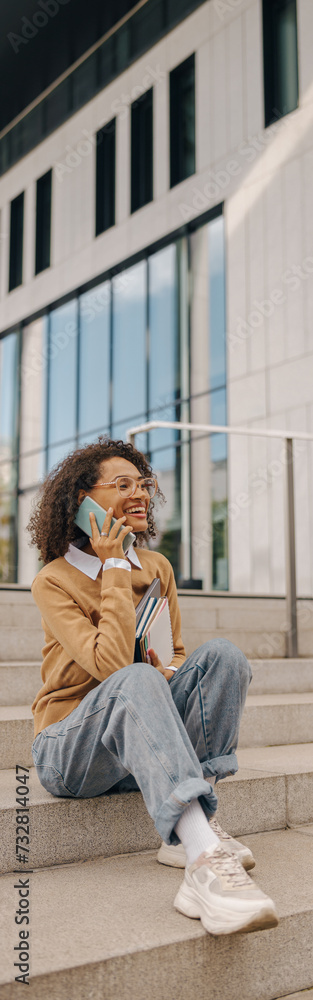 Cheerful business woman talking phone with client while sitting on stairs on building background