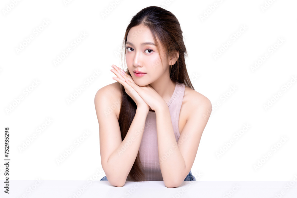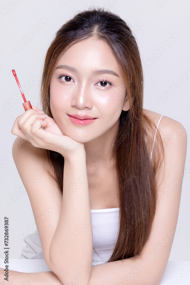Beautiful young Asian woman with natural makeup applying lipstick.