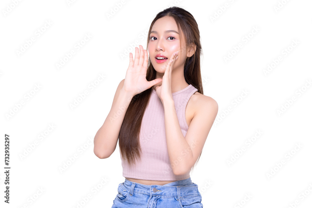 Beautiful young Asian woman with open mouths raising hands screaming announcements isolated on transparent background. Facial and skin care concept for commercial advertising. PNG file format.