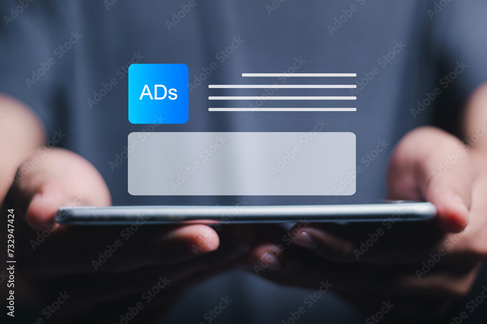 Digital marketing and online advertising to targeted customers. Person use smartphone with ADs on website. Shooting ads on cross feeds to optimize customer engagement.