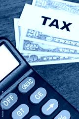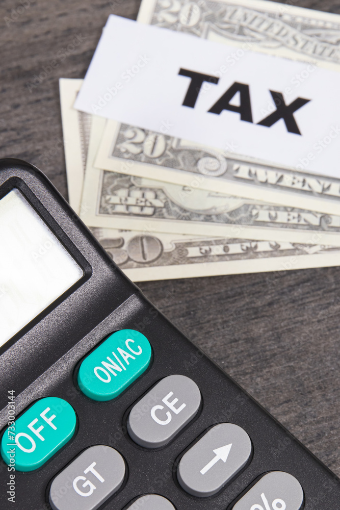 Calculator, inscription tax and dollar banknotes. Calculating and paying tax