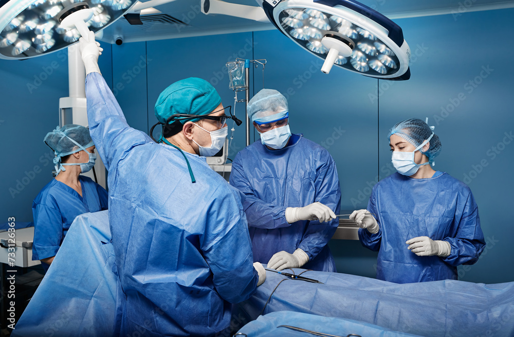Group of concentrated surgeons while surgical operation in operating theater. Teamwork in surgical department