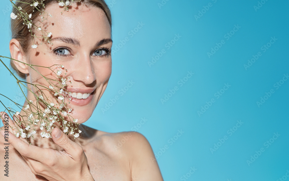 Skin care concept. Beauty portrait of smiling Caucasian woman with flowers near healthy moisturized facial skin, isolated on blue background