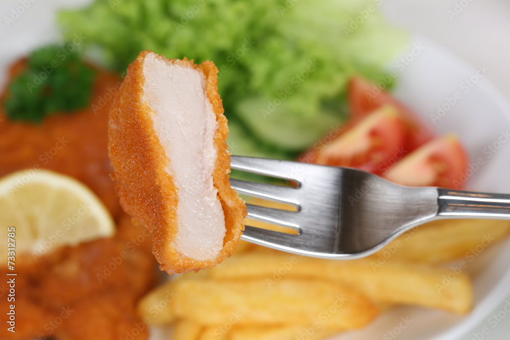 Paniertes Wiener Schnitzel Gericht essen mit Gabel