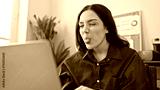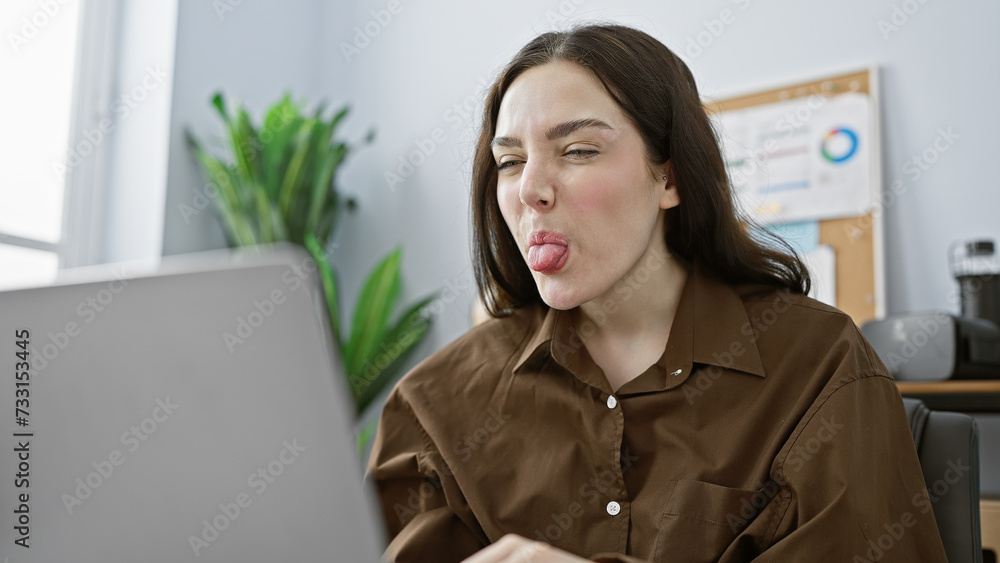 Young caucasian woman making a playful face in a modern office setting, depicting casual workday life.
