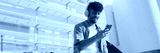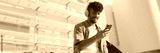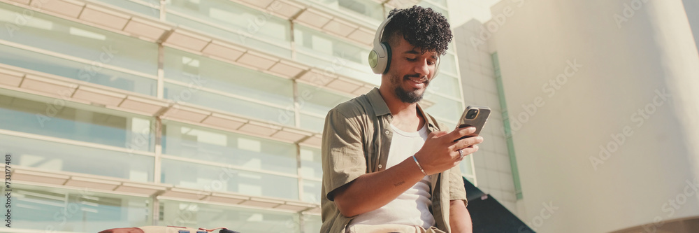 Young male student dressed in an olive color shirt sits outside next to the university, listens to music on headphones, selects tracks on his phone, Panorama