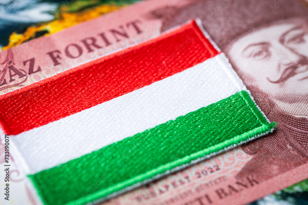 Hungarian forint exchange rate, Financial concept, Hungary money, Economic situation of Hungarians, country flag on the background of 500 forint banknote