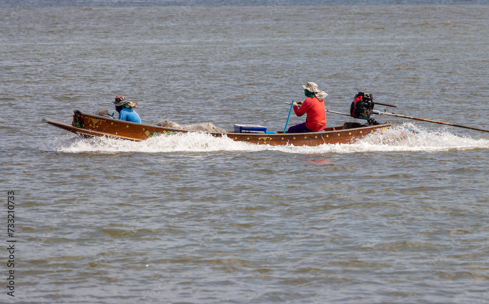 Asian fishermen sail on a boat with a fishing net, Thailand