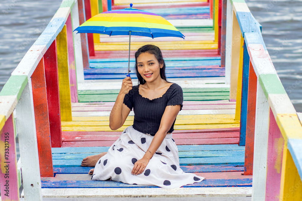 A young woman with a parasol sits on a colorful footbridge above the sea
