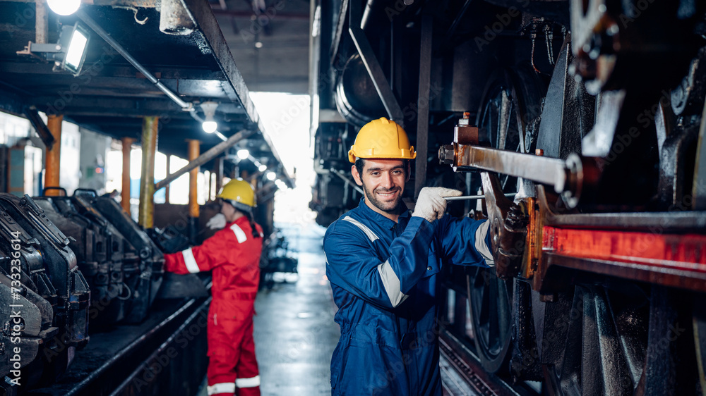 Team of engineer railway wearing safety uniform and helmet under checking under train ,wheels and control system for safety travel passenger. Maintenance cycle concept.