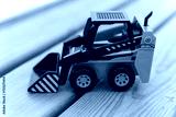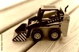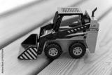 A toy loader with a striped bucket and bright wheels in a black and yellow color