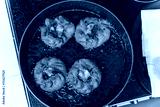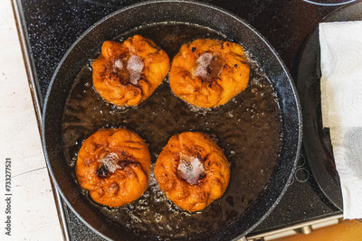 Raw belyashi with meat, baked in boiling oil in a frying pan traditional
