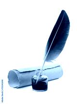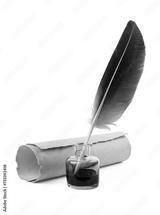 Feather with parchment and inkwell isolated. Calligraphy, old education, vintage handwriting