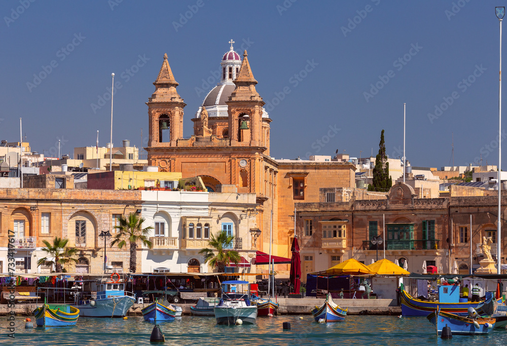 Multi-colored fishing boats luzzi with eyes in the harbor of the village Marsaxlokk on the island Malta.