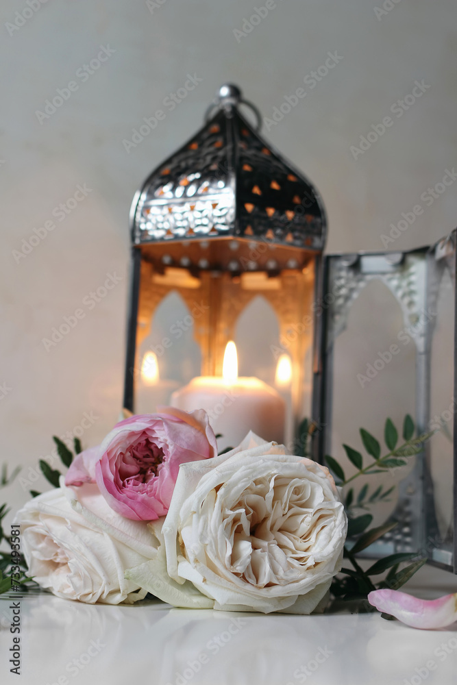 Silver Moroccan, Arabic lantern with burning candle. Pink roses flowers on white table. Festive still life for muslim holiday Ramadan Kareem or boho wedding. Blurred background, vertical.