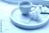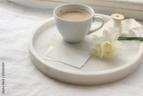 Breakfast still life. Cup of latte coffee, bouquet of narcissus, daffodil flowers on marble tray. Blank business cards mockups. White linen table cloth, ribbon. Blurred background. Spring wedding