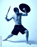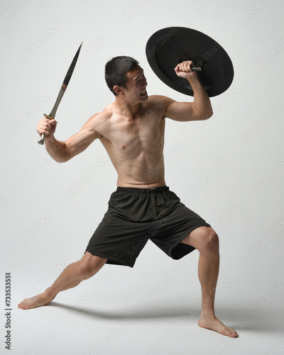 Full length portrait of fit handsome shirtless asian male model, Holding sword weapon and Spartan shield, standing in warrior training action pose, isolated on white studio background.