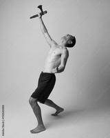 Full length portrait of fit handsome shirtless asian male model, Holding viking axe weapon, standing in warrior training action pose, isolated on white studio background.