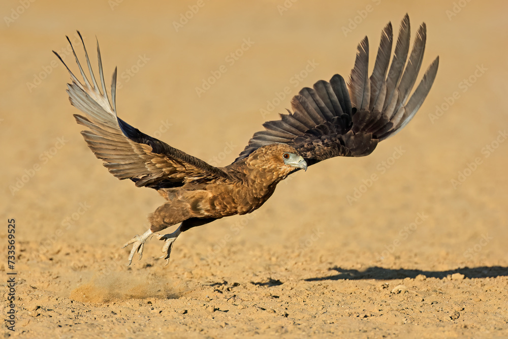 Immature bateleur eagle (Terathopius ecaudatus) taking off, Kalahari desert, South Africa.