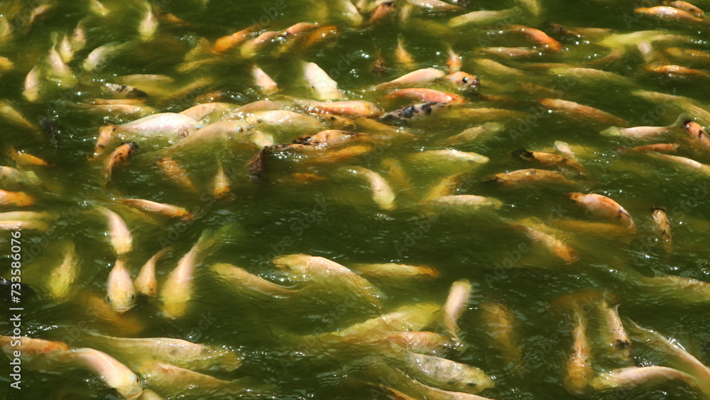 a group of red tombro fish or golden fish