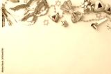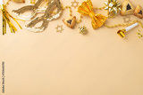 Elegant Purim invitation showcasing top view of triangular cookies, Star of David emblems, and luxurious gold party accessories like masks, bow tie, and beads on beige backdrop, leaving space for text
