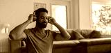 Young man with closed eyes, listening meditating music at home. Morning or evening workout routine, listening to music through wireless headphones.