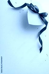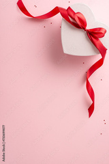 Charming gift suggestion for her: Top view vertical picture of a heart-shaped package with a red ribbon, sparkling sequins scattered on a light pink surface, with space for custom text or advertising