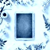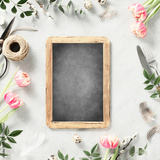 vintage chalk board, spring flowers and cutlery