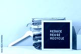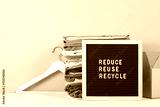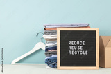 Black letter box and stack of folded clothes on blue background, reduce,reuse,recycle quote