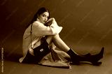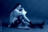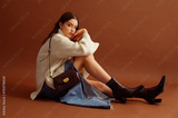 Fashionable confident woman wearing white sweater, denim skirt, pointed toe ankle leather boots, with trendy shoulder bag, posing on brown background. Full-length studio fashion portrait. Copy space